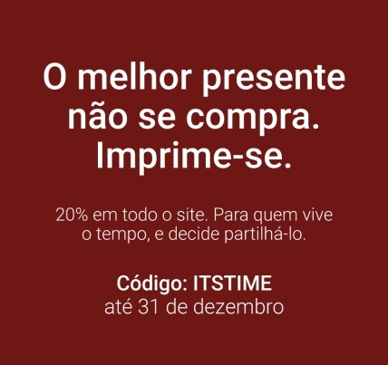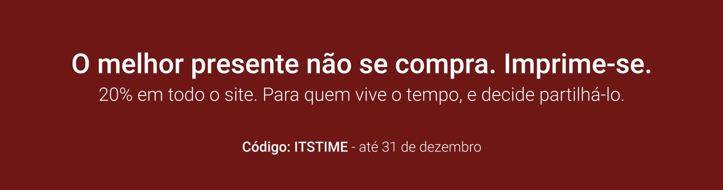 Campanha de 20% de desconto em todo o site, válida de 03/11/2025 a 31/12/2025, mediante a submissão do código ITSTIME. Campanha não acumulável com outras campanhas/vouchers em vigor. Packs de Fotos Standard 10x15cm e 15x20cm, Fotos 24h, Telas Sintéticas e produtos de Stock Off não incluídos.